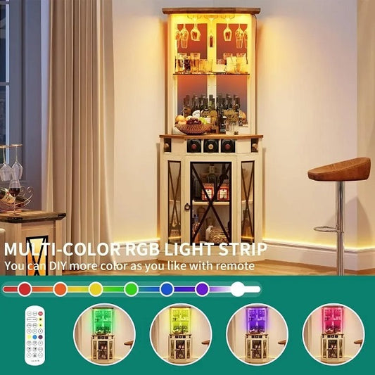LEAF Collection White Corner Wood Wine and Liquor Bar Cabinet with Glass Doors Shelfs and Multicolor LED