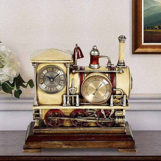 Retro Vintage Steam Engine Desktop Quartz Alarm Clock With Thermometer and Roman Numeral Display