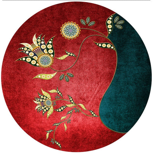 Luxury Far Eastern Art Style with Red Flowers Non-Slip Round Rug Carpet