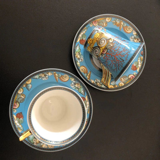 Versace Style Blue Ocean Luxury Coffee and Tea Porcelain 24 karat Gold Plated Sets