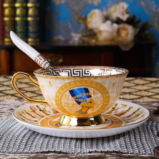 Porcelain Coffee or Tea Cup Gold Plated Legends of Egypt with Saucer and Spoon 24 Karat Gold Plated