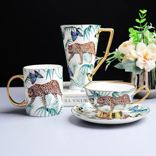Exquisite Luxury Royal Queen Bone China Beautiful Forest Jaguar Design Coffee and Tea Mugs and Cups Set
