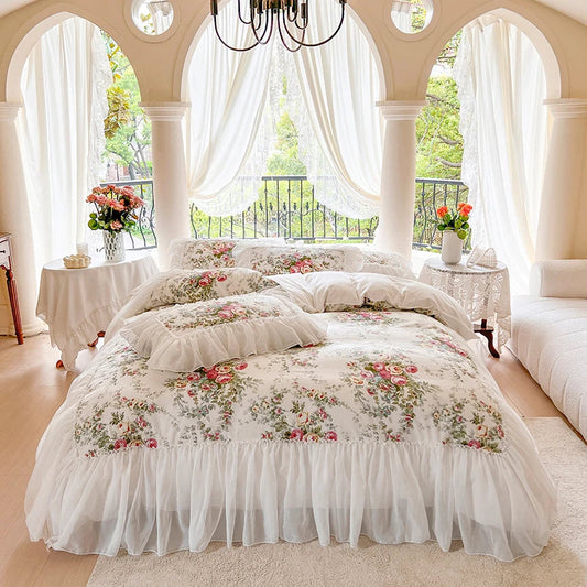 Luxury Romantic Princess Flowers Cotton Chiffon Lace Ruffles Duvet Cover Bedding Set With Pillow Covers