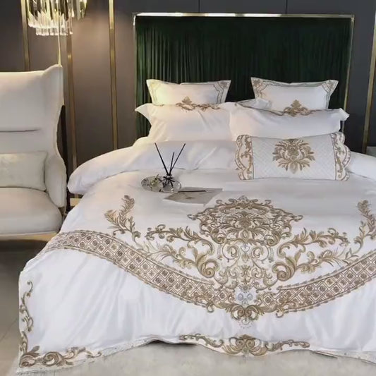 Luxury bedding sets are high-end collections of bedroom linens that provide both exceptional comfort and elegant design. These sets typically include a combination of sheets, duvet covers, pillowcases, shams, and sometimes decorative elements like bed skirts or throws. They are made with premium materials and crafted to deliver superior softness, durability, and a touch of sophistication.Shop Our Unique Luxury Bedding and Accesuaries Made from the best of Egyptian Cotton with exellent quality and wonderful embroidery.