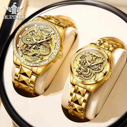 Men's and Woman Set 3 D Golden Dragon and Phoenix -Shaped Gold Engraved Wrist Watch Luxury Timepiece Tourbillon Chronograph Automatic Movement Waterproof Luxury Skeleton with Sapphire Crystal