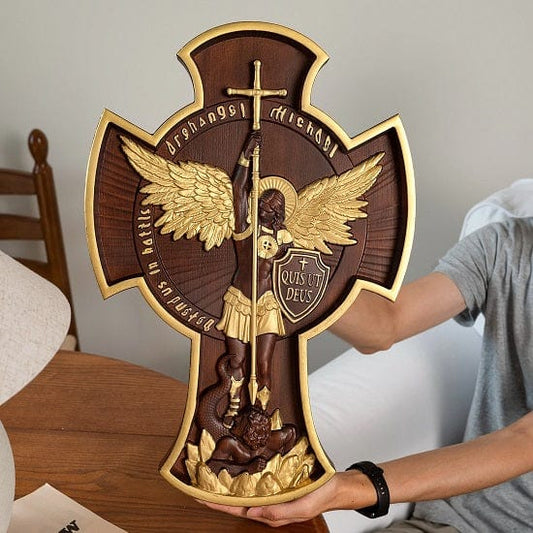 Saint Michael Archangel Defeating Satan Cross Wood Hand Carved Statue
