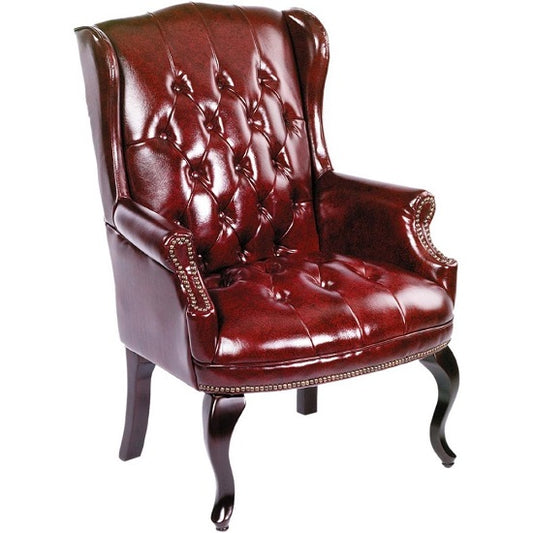 Elegant Mahogany Wood Finish Vintage Designer Wingback Traditional Burgundy Armchair