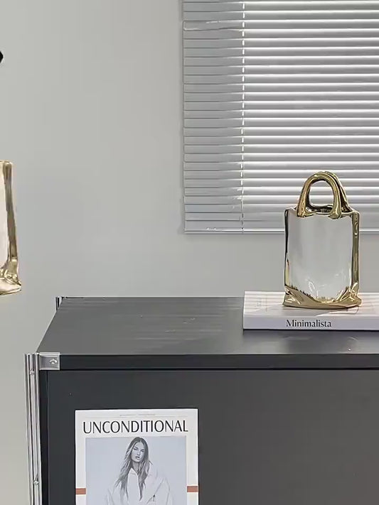 Designer 24 Carat Gold Plated Handbag Shape Vase Ceramic Plant Pot Table Decoration Flower Arrangement Set of Two