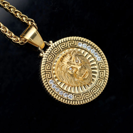 Lion King Amulet Pendant Necklace Stainless Steel with Rhinestone for Man and Woman