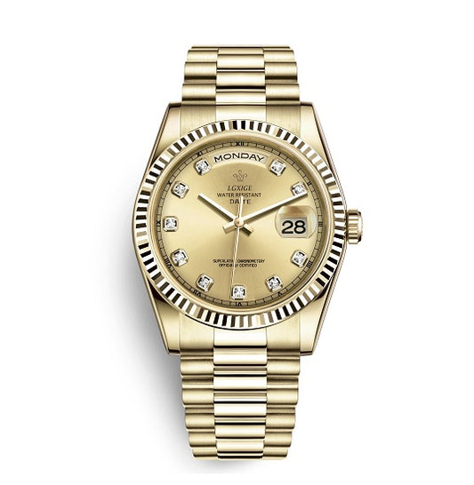 Elegant Luxury Anti Fog Quartz Chronograph Gold Fluted Bezel Pearl Diamond Dial Waterproof with Day Display Watches for Man