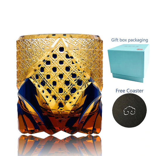 Exquisite Unique Private Collection Japanese Kiriko Style Crystal Gem Amber Whiskey Glass Manual Diamond Cut Lead Free Glass