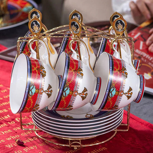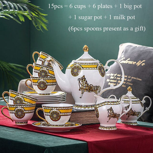 Elegant Luxury English Royal Court Style Hand Made Fine Porcelain Bone China Gold Plated Coffee and Tea Set 15 Pices