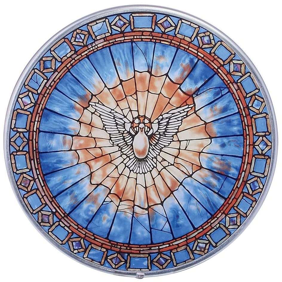 Doves represent many things: hope, salvation, love, and devotion; Tiffany's illustrious round stained glass art window depicts a dove ascending among the folds of brilliant sunlight in a bright cobalt blue sky surrounded by a brilliant jeweled background. Tiffany made it his creative life-long goal a "pursuit of beauty" as he labored to improve the stained glass process. He invented a myriad of new shades, colors and types of blended and opalescent glass, in consequence all of his antique decorative windows set the bar for all stained glass.
