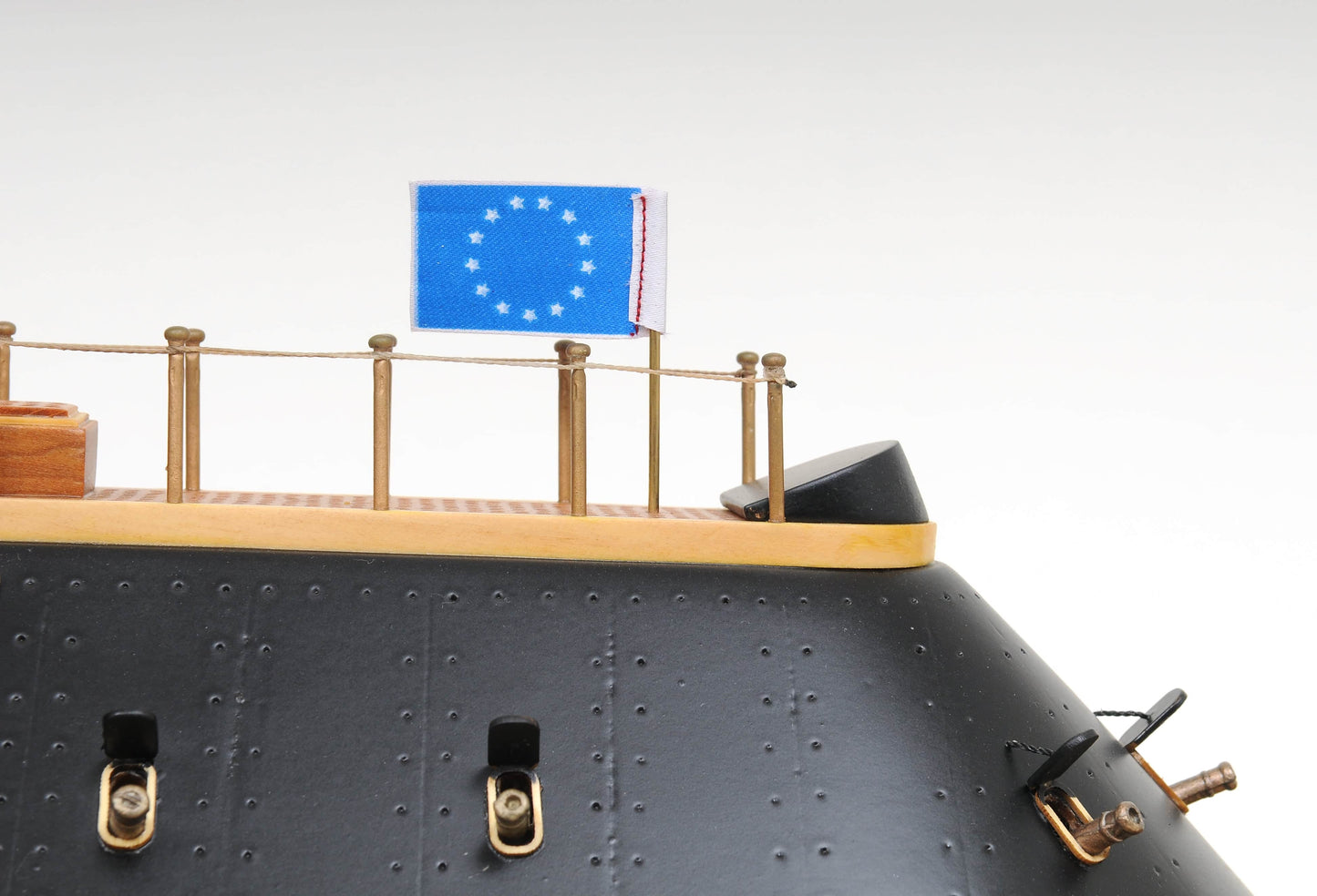The C.S.S. Virginia magnificent features include intricate details such as: wooden planked deck, upper wooden deck, planked lifeboats, metal anchors, smoke stack with metal rings, wooden cannons, wooden rudder and Confederate flags.