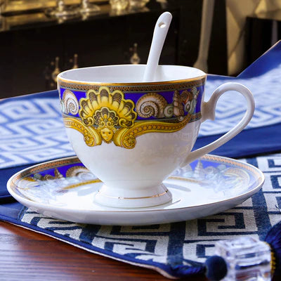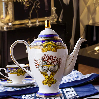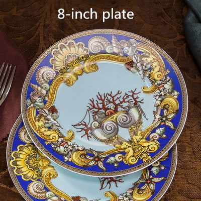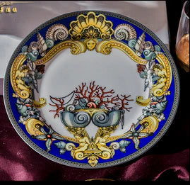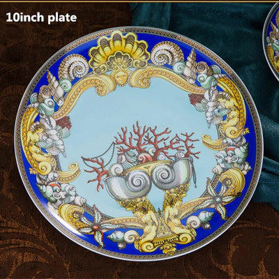 This Luxury European Royal Style Fine Porcelain Dinner Set is crafted by hand and features a deep blue ocean motif. Set for 10, it's perfect for creating a special occasion atmosphere. Made of fine porcelain, this set is sure to bring an air of sophistication to your next gathering.