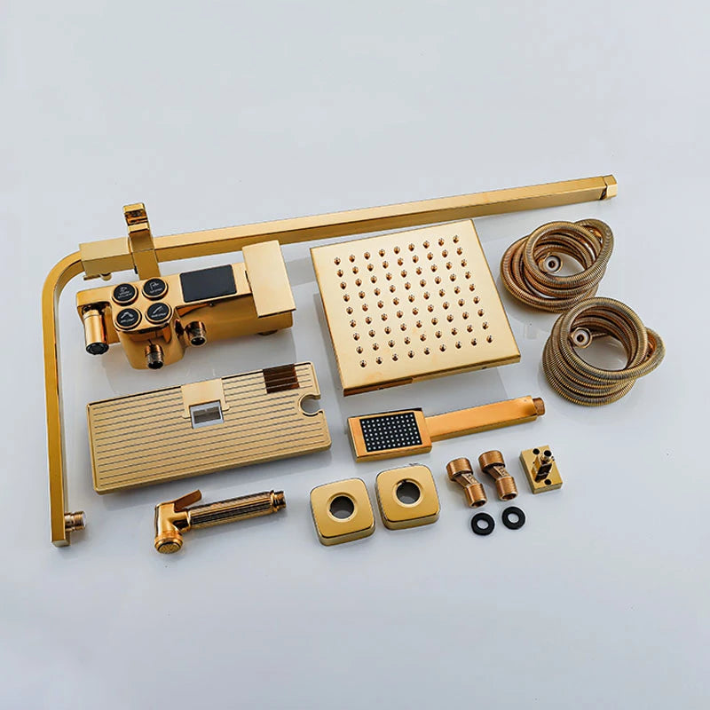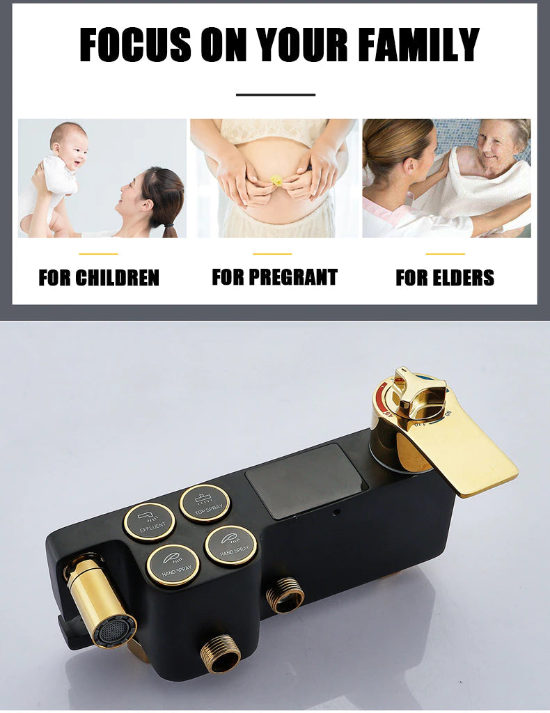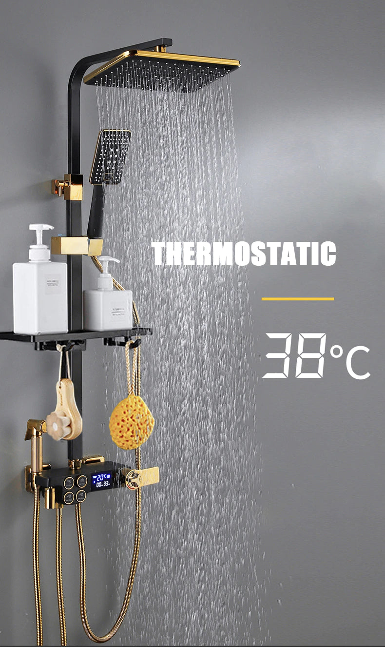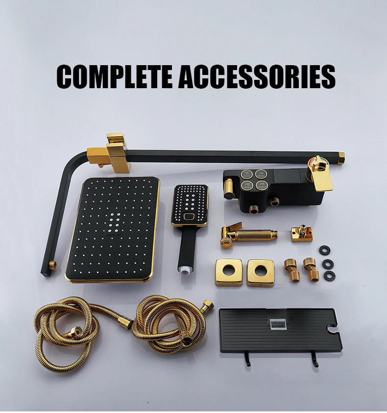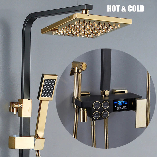 Introducing our Digital Bathroom Shower System – the perfect combination of luxury and technology. With LED lights and a Smart Thermostat Temperature Display, you'll have the perfect shower every time. Experience wall mount rainfall with the sleek Gold and Black design. Upgrade your shower game today.