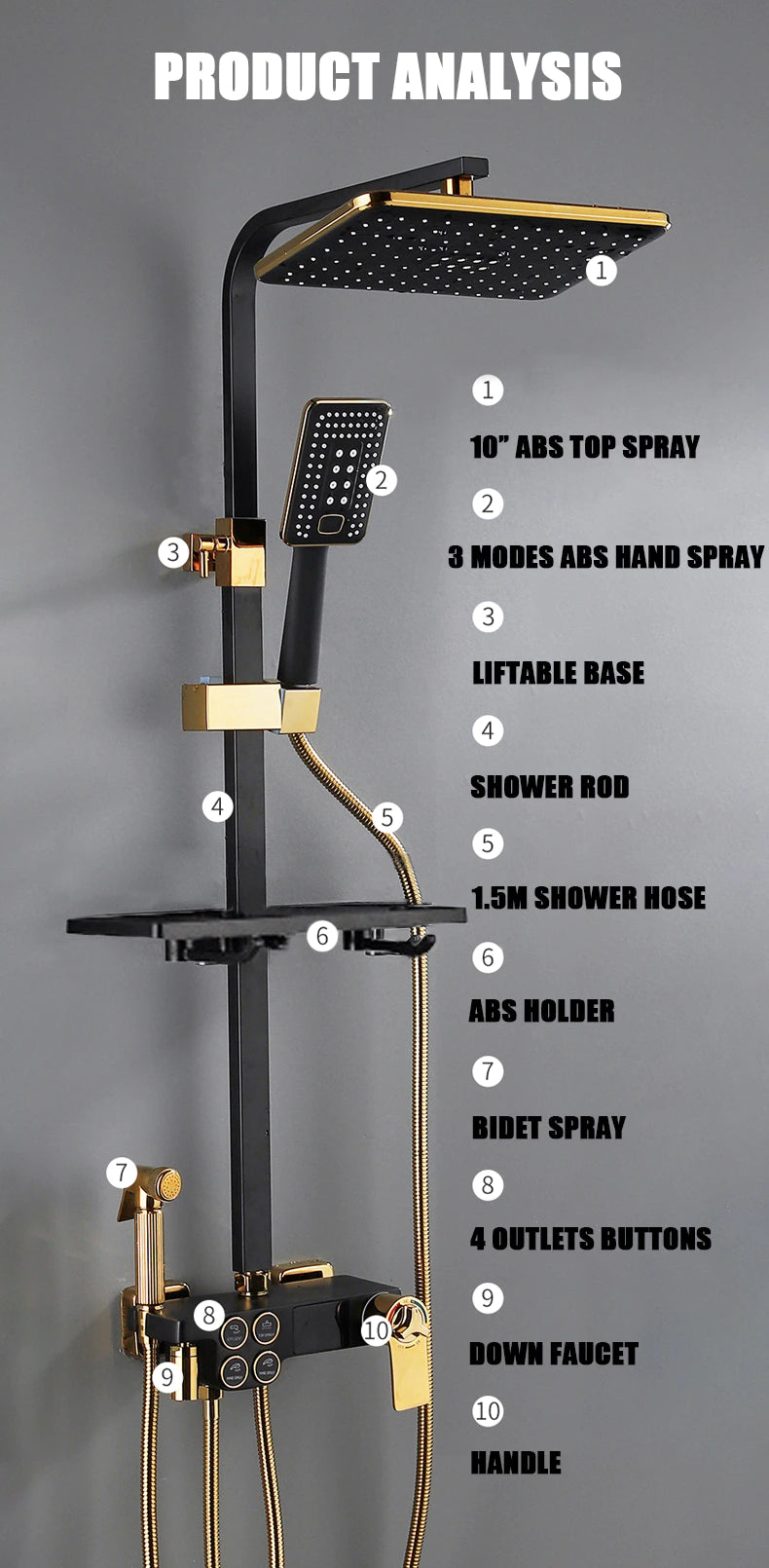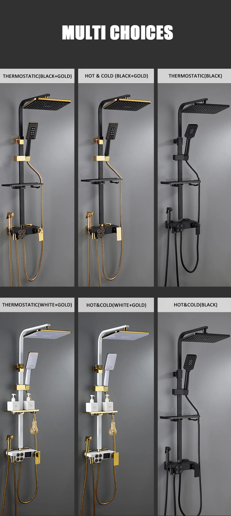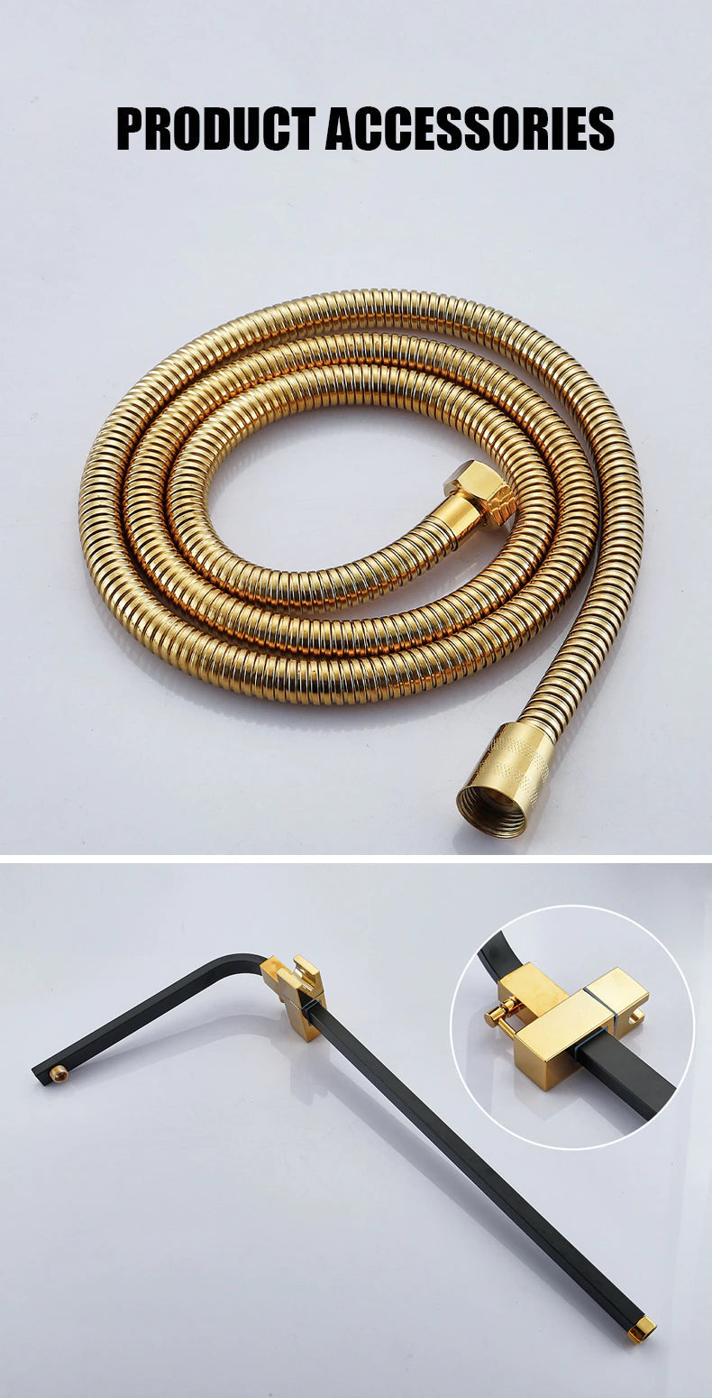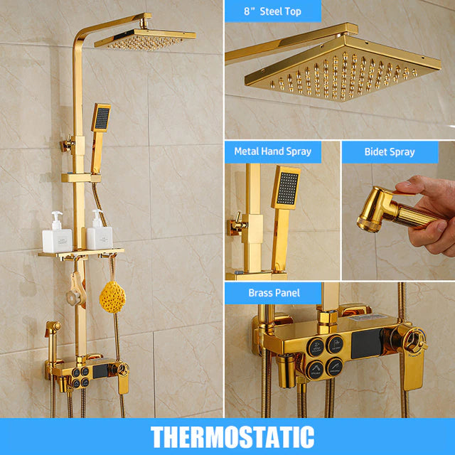 Introducing our Digital Bathroom Shower System – the perfect combination of luxury and technology. With LED lights and a Smart Thermostat Temperature Display, you'll have the perfect shower every time. Experience wall mount rainfall with the sleek Gold and Black design. Upgrade your shower game today.