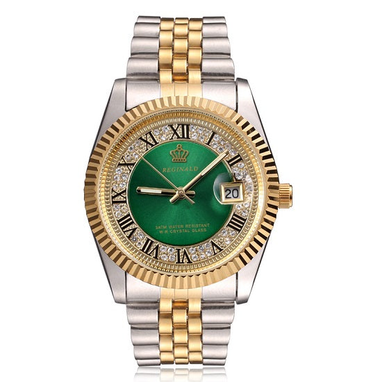 This elegant luxury men's watch features a gold fluted bezel and a pearl diamond dial, blending timeless style with premium materials. Equipped with an anti-fog quartz chronograph, it offers precise timekeeping and clear visibility in various conditions. The watch includes a practical day display and is waterproof, ensuring durability for everyday use. Designed for discerning professionals, it combines sophistication with reliable performance.