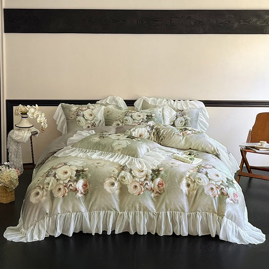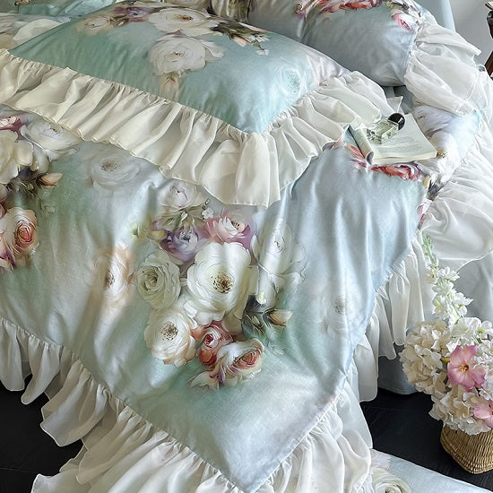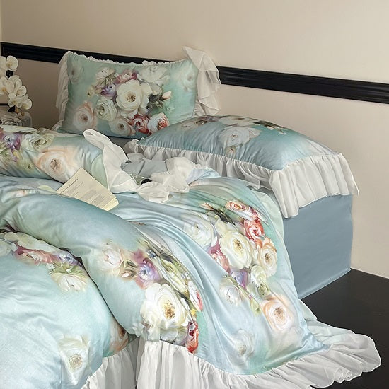 Luxury Romantic French Flowers Lace Ruffles Soft Silky Ice Silk Duver Cover Bedding Set with Pillow Cases
