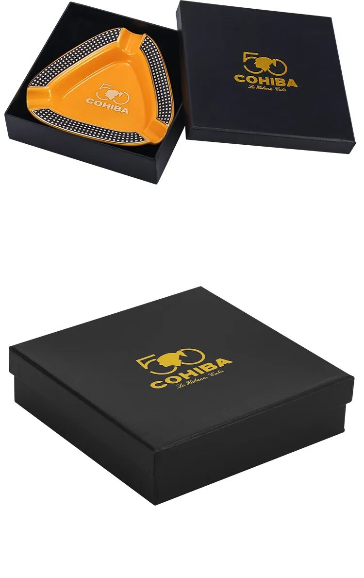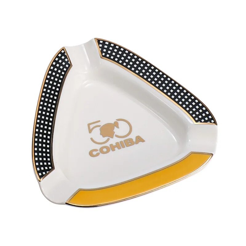 This exclusive design ashtray by Nelson Alfonso is crafted from fine ceramic. The triangle shape and unique Cohiba yellow hue make it perfect for storing and disposing of cigars and cigarettes.