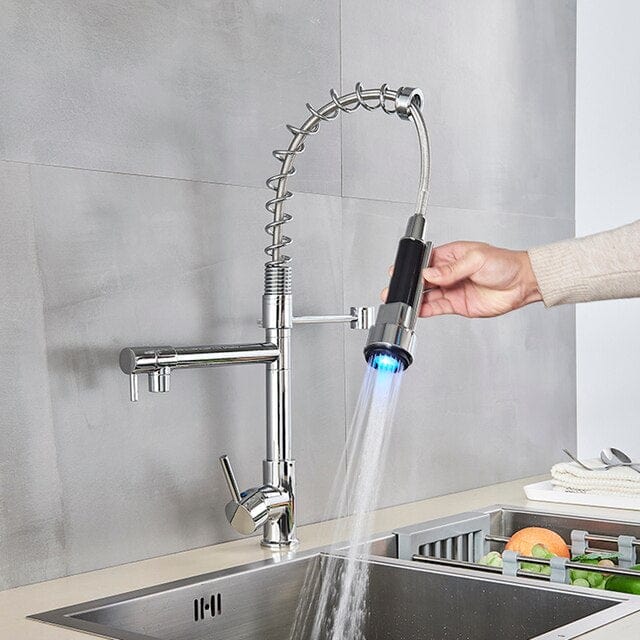 Heavy-duty LED Light Spring Pull Down Kitchen Sink Faucet Tap is a robust commercial addition to any kitchen. It offers reliable dual spout flow controlled by a high-quality deck mounted design and a heavy-duty LED light for illumination. Enjoy the peace of mind of a Senlesen certified product in your home.
