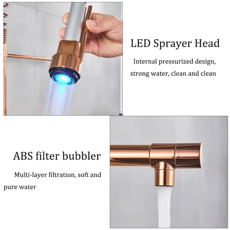 Heavy-duty LED Light Spring Pull Down Kitchen Sink Faucet Tap with Dual Spout Deck Mounted.