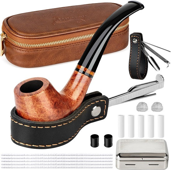 This high-quality natural briar wood pipe set offers exceptional craftsmanship paired with practical accessories. Included are a PU leather pouch, a stand holder, and essential pipe tools, providing both protection and convenience. The natural briar wood ensures durability and a refined smoking experience, making this complete set perfect for enthusiasts who value both style and functionality.