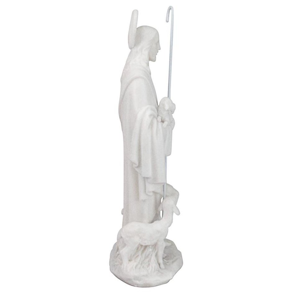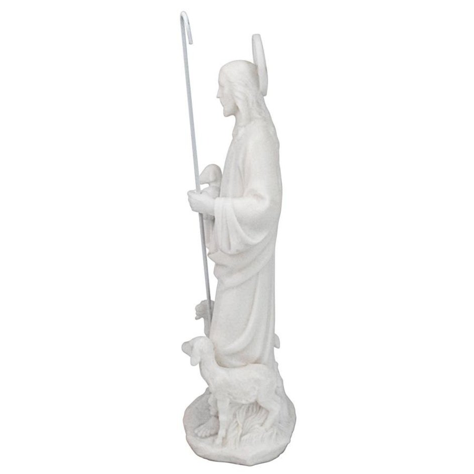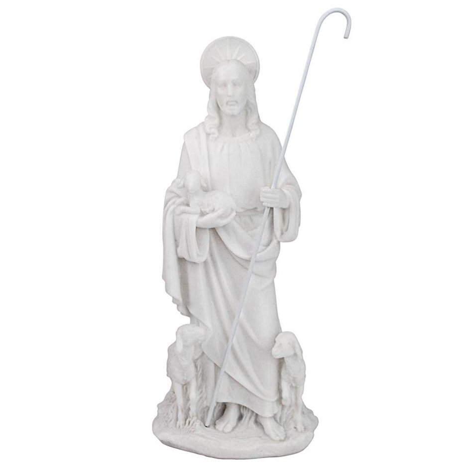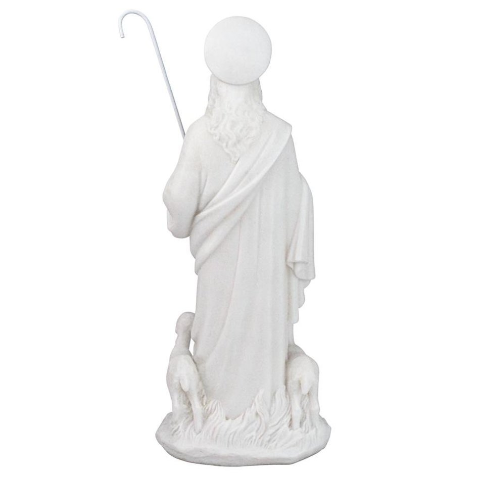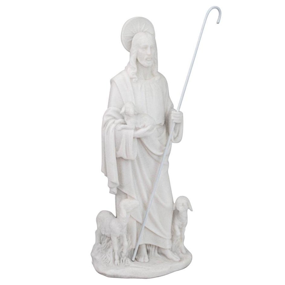 The historic Jesus Christ of Nazareth declared himself the Good Shepherd, the one who protects, guides and nurtures his flock of followers. Sculpted with detail from staff to crown, our quality bonded marble resin religious statue depicts the Passover Lamb on his earthly mission. Available only from us, this collectible work of religious art is ready for proud display or to admire in a place of quiet contemplation.
