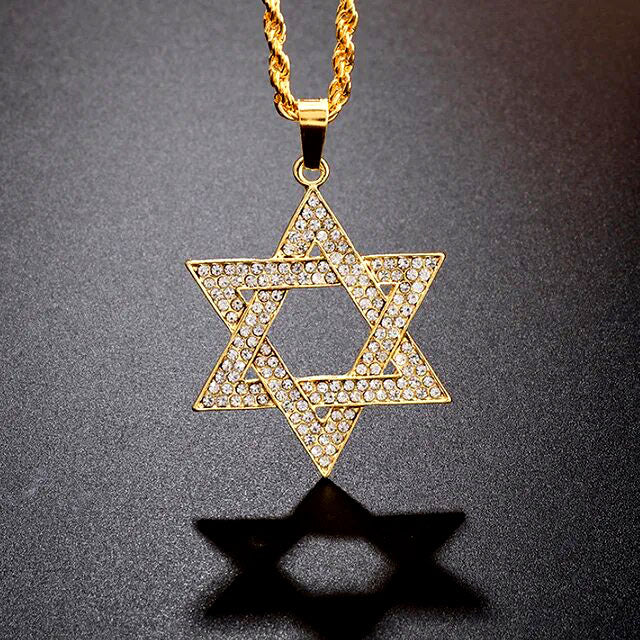 This Jewish Star of David pendant necklace features sparkling rhinestones, symbolizing health, prosperity, and protection. The perfect accessory for both men and women looking to embrace their faith while adding a touch of elegance to any outfit. A must-have piece for any religious or fashion-forward individual.