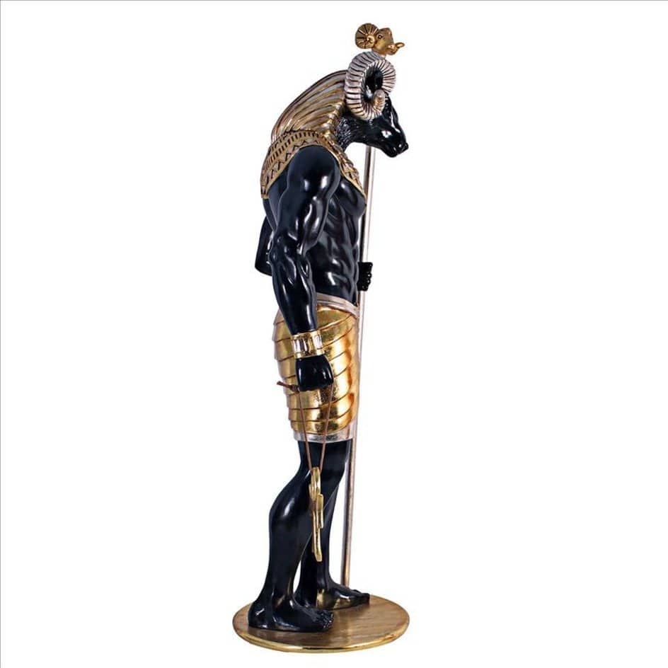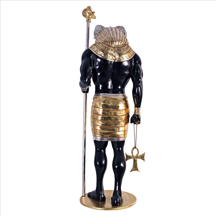 We guarantee heads will turn toward this enormous, more than six-foot tall, indoor masterpiece statue whose wow factor rivals every other grand-scale Egyptian sculpture we've produced! Paying homage to Khnum the ram-headed god of the Nile who created mankind, our exclusive statue is a more-than-powerful statement piece, complete with scepter and ankh.