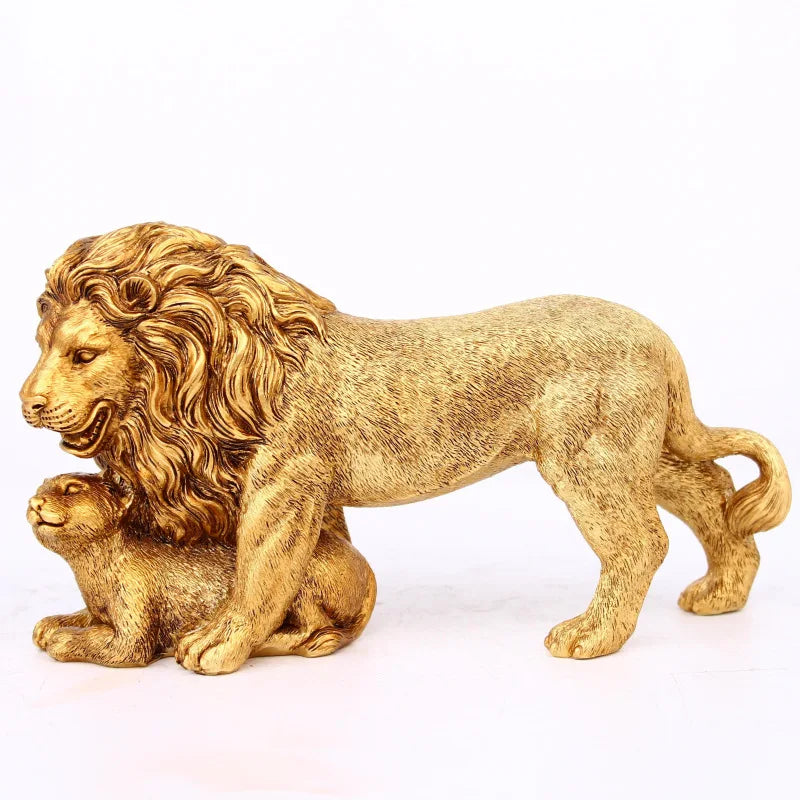 Golden Lion King With Lion Cub Animal Statue Sculpture
