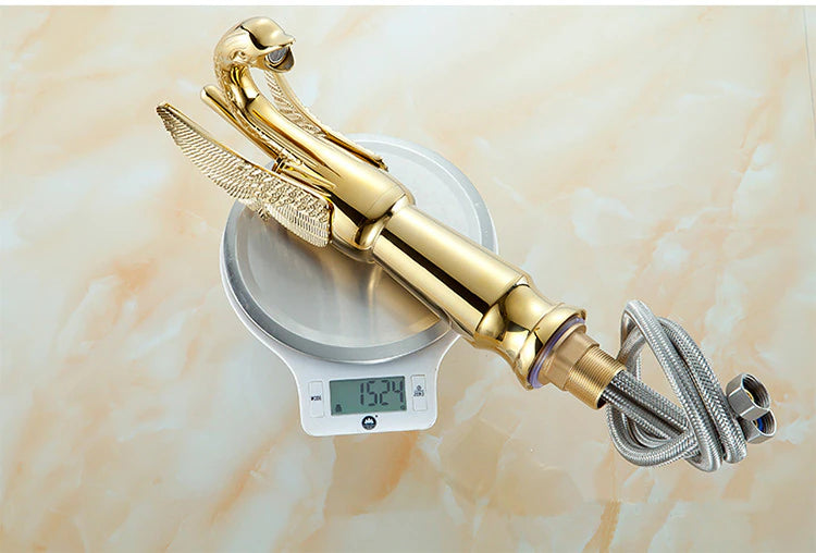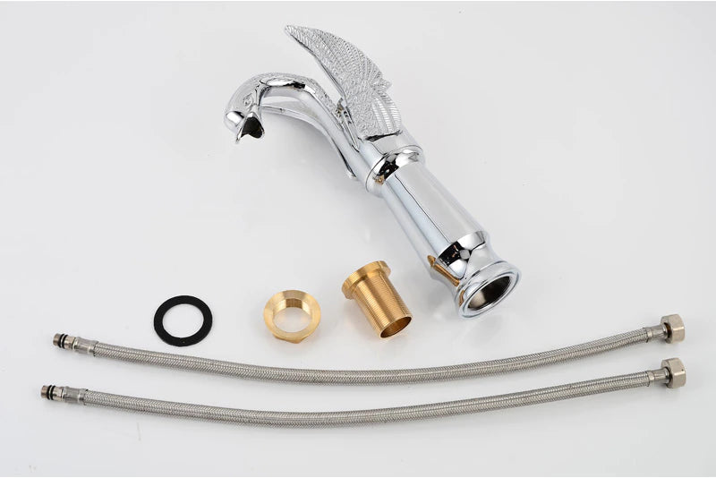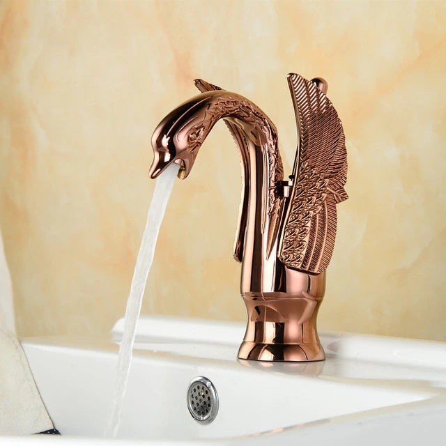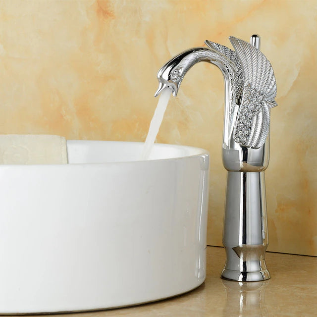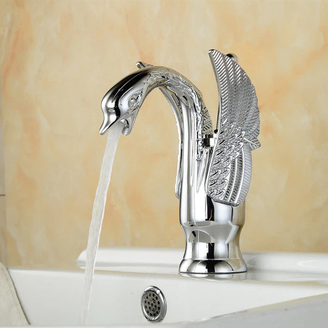 This luxury contemporary European bathroom faucet boasts a stylish swan design with a deck mounted single handle for cold and hot water. Crafted from brass for superior durability and lasting quality, it will add a touch of luxury to any bathroom.