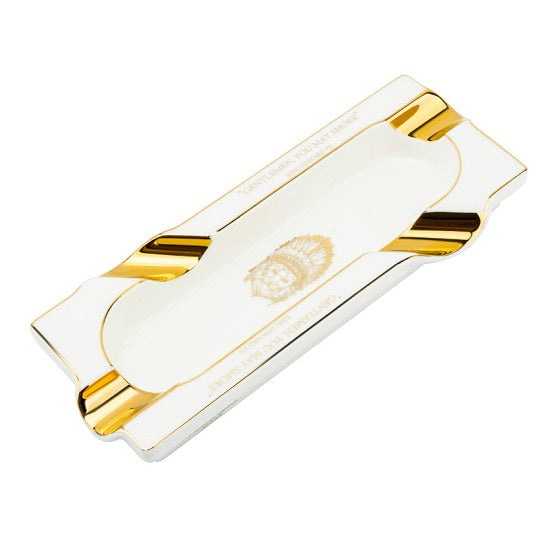 This hand-made ceramic ashtray is designed to be both luxurious and functional. With four windproof slots, it ensures that ashes and smoke are contained, providing a clean environment. The exclusive gold plated design adds a touch of elegance to any space. Expertly crafted by Lubinski Sigars.
