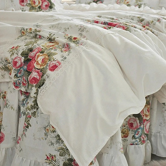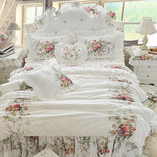 Luxury White Lace Princess Flowers Cotton Lace Ruffles Duvet Cover Bedding Set With Pillow Covers