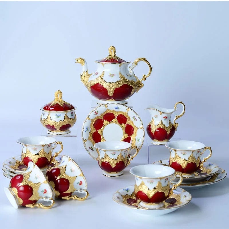 Indulge in the luxurious and opulent Royal Cort Coffee Tea sets. Made with fine porcelain and adorned with a 24 K gold plated design, each set exudes a sense of elegance and sophistication. Savor your favorite beverages in style with these exquisite Marune and White sets.