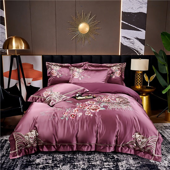 This luxurious bedding set features intricate embroidery of beautiful flowers, crafted from high-quality silk and Egyptian cotton for a soft and comfortable sleep experience. The royal style adds a touch of elegance to any bedroom, while the included pillowcases complete the look. Transform your sleep experience with this premium set.