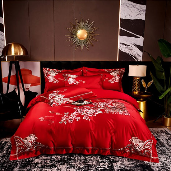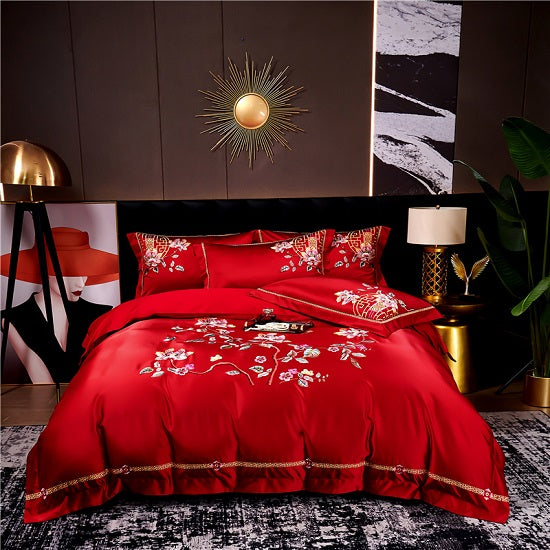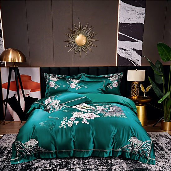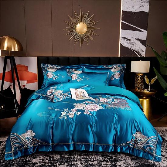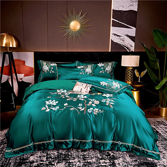Royal Luxury Style Embroidery Flowers Silk Egyptian Cotton Duvet Cover Bedding Set with Pillowcases