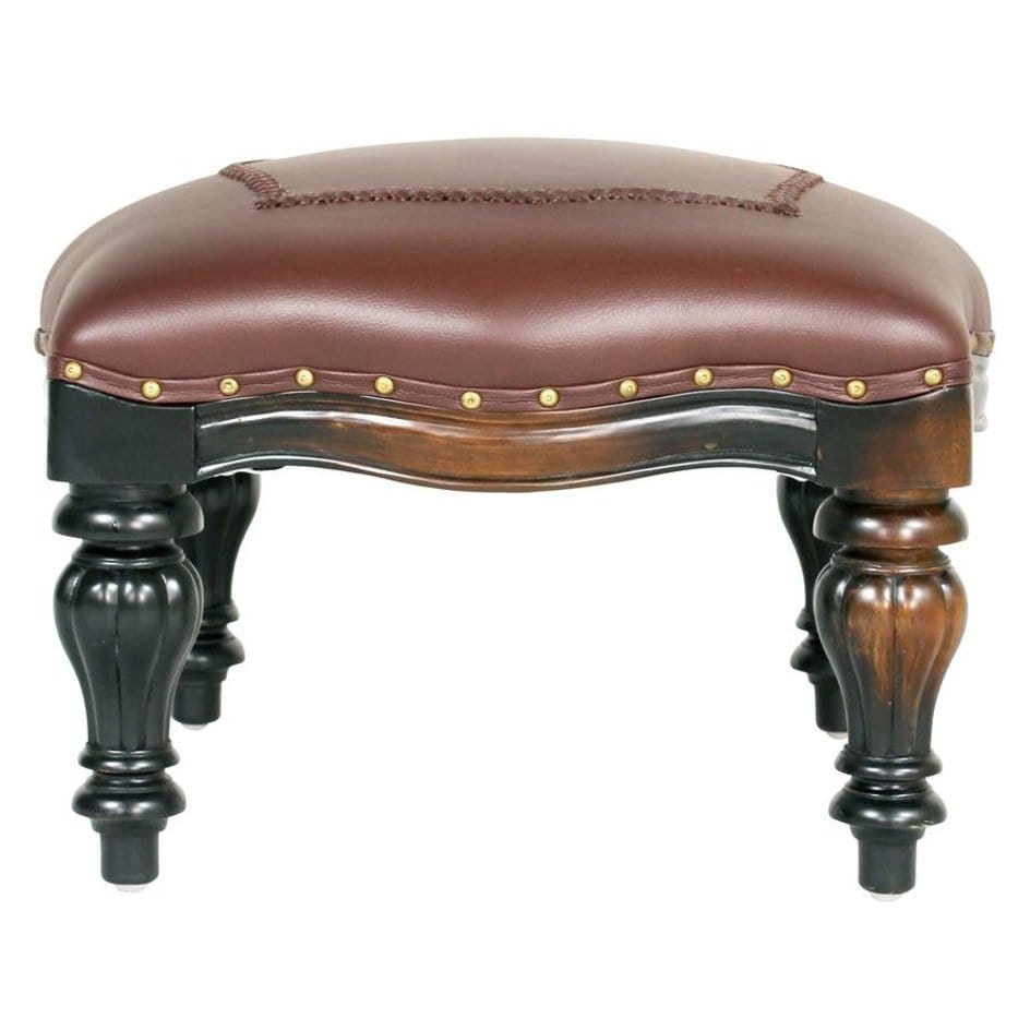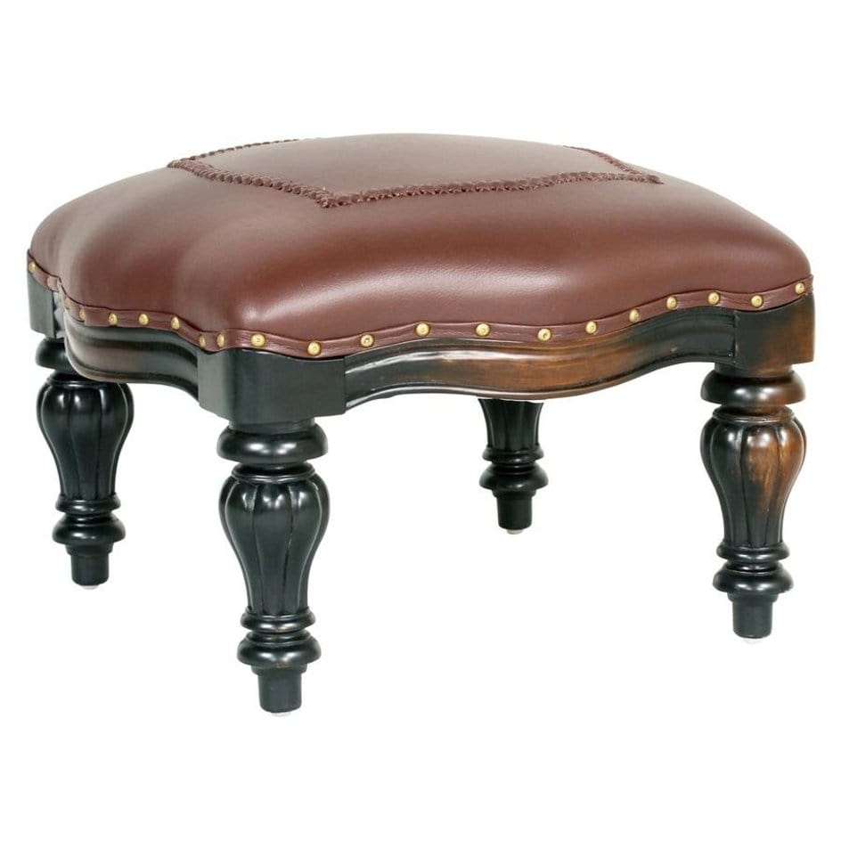 We can't remember if we were first attracted by the tastefully detailed hand-carving or the tobacco-colored faux leather stretched on the dark mahogany, comfortable frame of this ottoman. Whatever the reason, we've continued to admire the detailing-Victorian curves finished front and back with braided trim and hand-carved legs. You'd usually expect to find this much deep-seated comfort only in the library of a mid-19th century English country home.