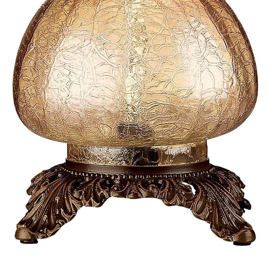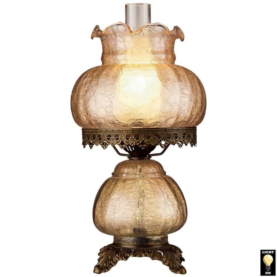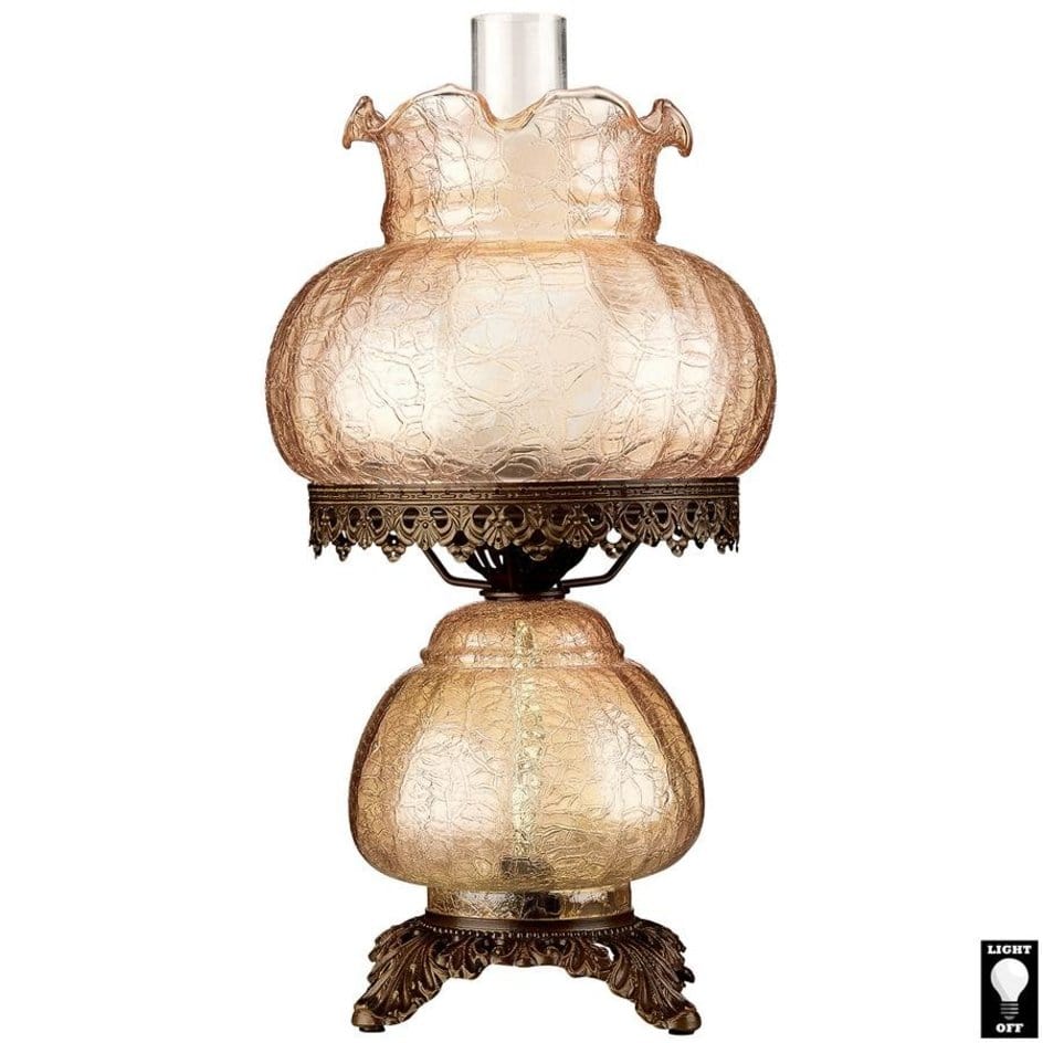 Fit for a princess! This charming reproduction of a Victorian hurricane parlor lamp emits a warm pale rosy glow featuring two lights: one above, and the warm light in base makes a perfect night light. The wavy liquid glaze finish on the glass creates a pleasant luminosity inspired by traditional oil-burning lamps, as it rises from acanthus leaf metal feet to a metal collar like a touch of lace and finished in faux antique brass. Recreating a lamp that is prized by collectors, this Rose Court s crimp top shade surrounds the glass hurricane chimney and will be a welcome addition to any bedroom, parlor, or side table. Accepts two bulbs: one 7-watt and one 60-watt bulb; with a 3-way switch on cord. Ships in three pieces; simple assembly required.